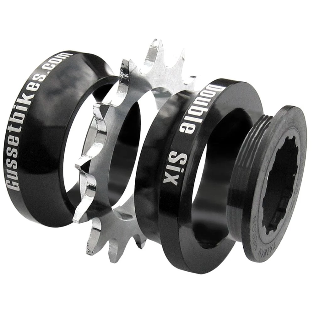 The Double Six single speed kit is our premium level kit featuring a 7mm wide spline base Shimano HG type spline fit sprocket to ensure power transfer doesn’t score or destroy alloy freehub bodies. The lightweight alloy tapered spacers are designed to offer increased lateral support for the sprocket under load.