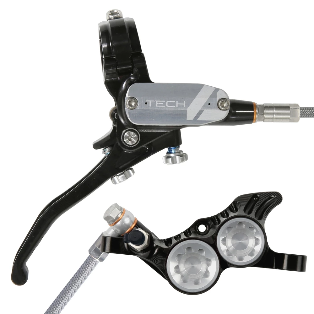 The all new Tech 4 V4 builds on our 25+ years’ experience designing and manufacturing hydraulic brake systems. The Tech 4 uses all new internal sealing for reduced friction and the pivot spins on roller bearings, allowing the spring rate to be reduced. The lower spring rate in turn gives a lighter lever action, reducing rider fatigue and keeping our legendary feel and modulation. The updated V4 caliper utilises hybrid style Stainless steel pistons with a phenolic insert allowing for smoother movement and less maintenance, while still able to manage high temperatures without heat transfer during extreme use.
