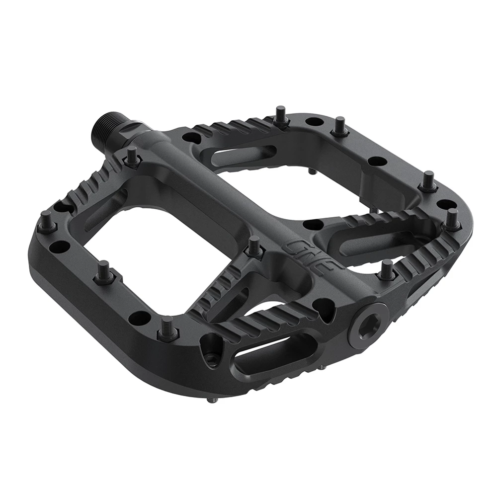The OneUp Composite Pedals features a huge (115x105mm) super grippy platform with 10 rear-loading steel pins per side to keep your feet planted on even the roughest of trails. With a weight of only 355g, they won’t slow you down on the climbs. Designed from stealth rubber down and shaped with a subtle convex profile to provide you with more grip thanks to the pedals sitting in the natural arch of your foot. The thin leading edge chamfered design gives you maximum clearance to reduce pedal strikes and deflect off trail obstacle.