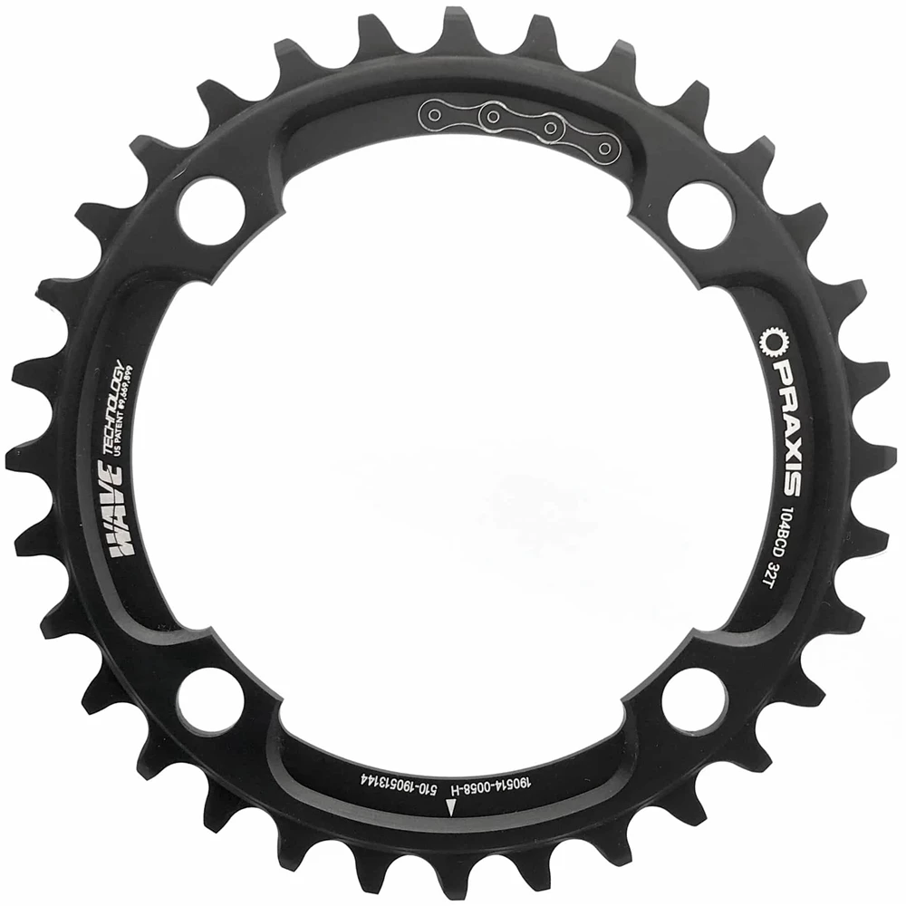 Tough enough for Enduro, Downhill, and also weight conscious for XC riding, Praxis MTN Wave™ rings are machined from 7075 T6 aluminum and hard anodized to take a beating. Licensed and developed in conjunction with Mountain Racing Products, the Wave™ pattern tooth profile applies alternating lateral force to each chain link to actively retain the chain to the ring – going beyond narrow/wide implementations that rely solely on friction, while allowing room for mud, debris, and grit to escape. The Wave™ design also wears more slowly than competing designs by spreading the load over larger surface areas.