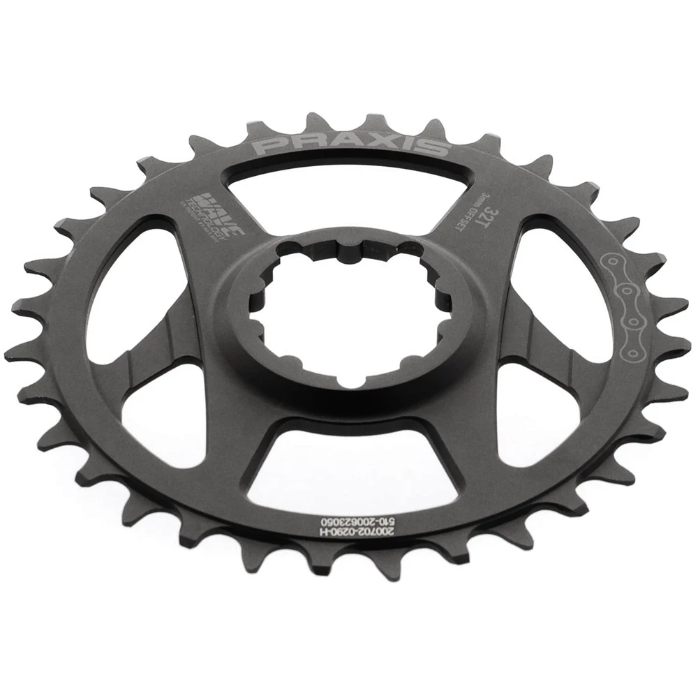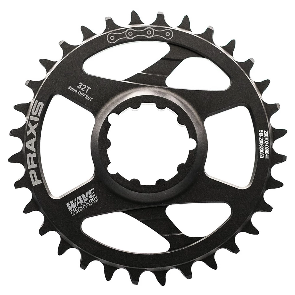 Tough enough for Enduro, Downhill, and also weight conscious for XC riding, Praxis MTN Wave™ rings are machined from 7075 T6 aluminum and hard anodized to take a beating. Licensed and developed in conjunction with Mountain Racing Products, the Wave™ pattern tooth profile applies alternating lateral force to each chain link to actively retain the chain to the ring – going beyond narrow/wide implementations that rely solely on friction, while allowing room for mud, debris, and grit to escape. The Wave™ design also wears more slowly than competing designs by spreading the load over larger surface areas.