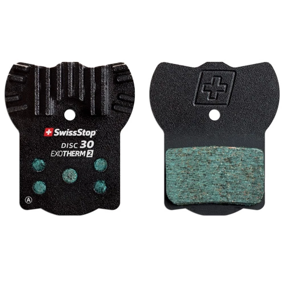 SwissStop EXOtherm 2 pads combine an extremely durable, smooth modulating pad compound with a cooling fin equipped back plate which provides consistent, powerful braking in all conditions.