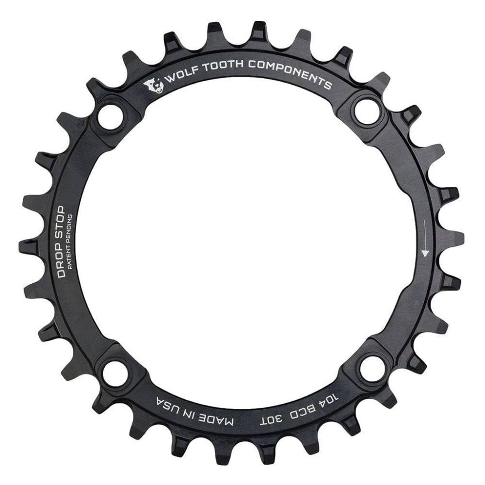 Drop-Stop technology. On Wolf Tooth’s patented wide/narrow chainring, the wide side of the tooth has maximum contact on the drive side which spreads the load and improves chainring life. The narrow side allows clearance for mud and debris which reduces friction.