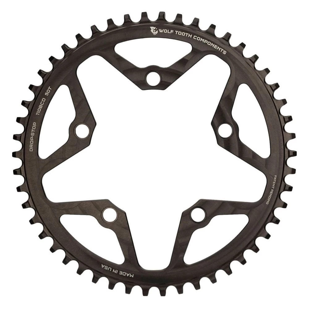 - Drop-Stop technology. On Wolf Tooth’s patented wide/narrow chainring, the wide side of the tooth has maximum contact on the drive side which spreads the load and improves chainring life. The narrow side allows clearance for mud and debris which reduces friction.