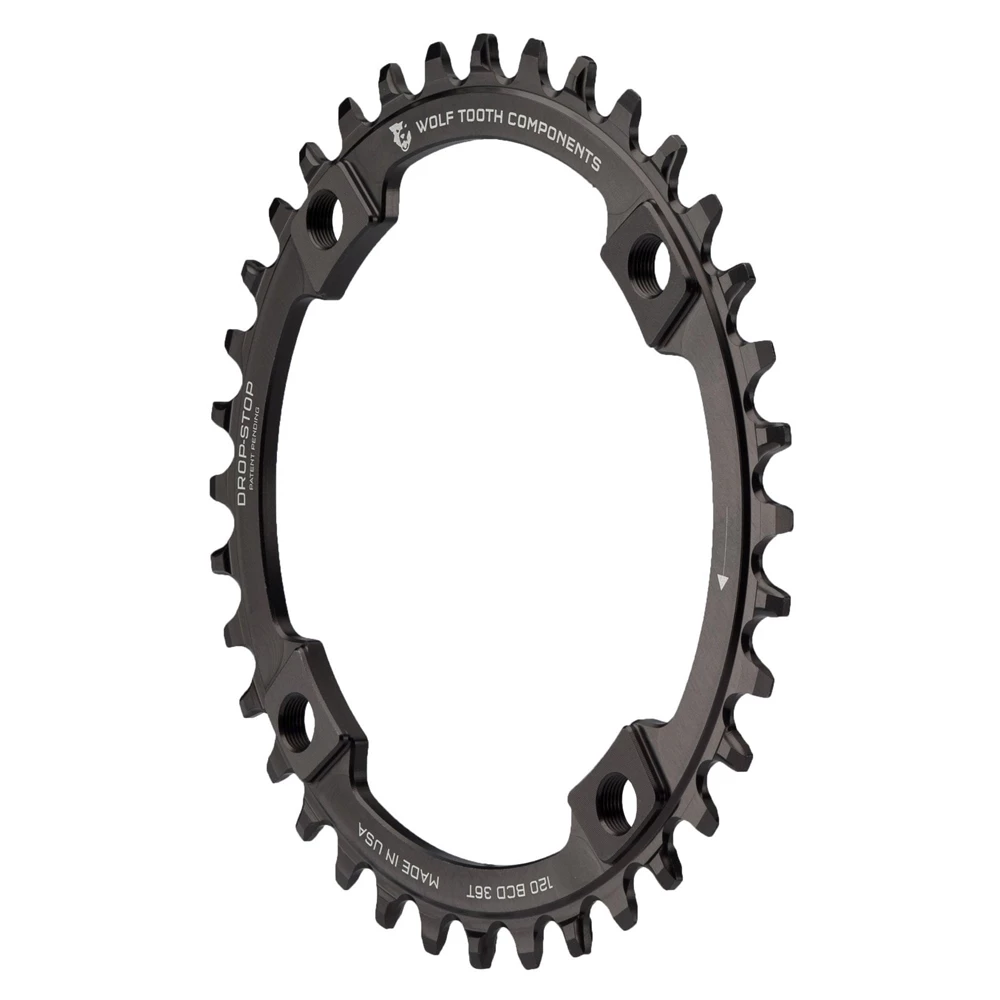 - Drop-Stop technology. On Wolf Tooth’s patented wide/narrow chainring, the wide side of the tooth has maximum contact on the drive side which spreads the load and improves chainring life. The narrow side allows clearance for mud and debris which reduces friction.