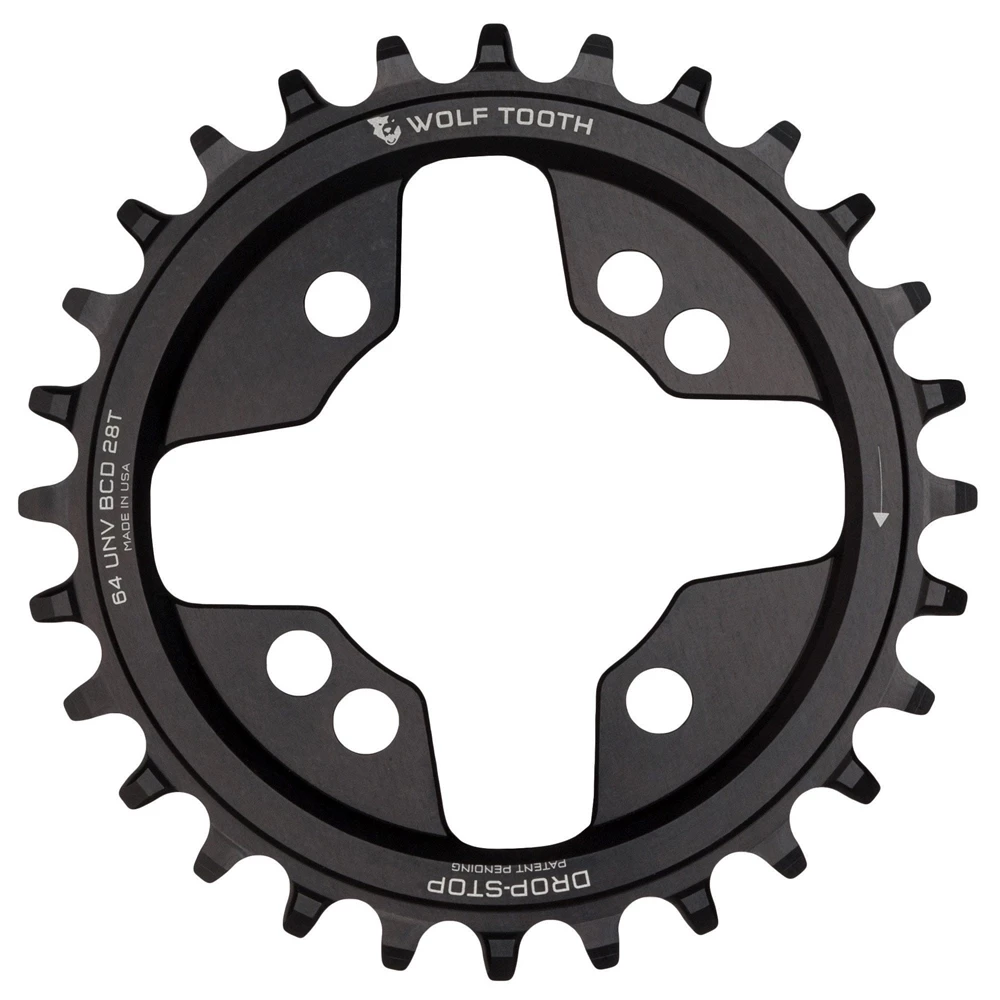 - Drop-Stop® technology. On Wolf Tooth’s patented wide/narrow chainring, the wide side of the tooth has maximum contact on the drive side which spreads the load and improves chainring life. The narrow side allows clearance for mud and debris which reduces friction.